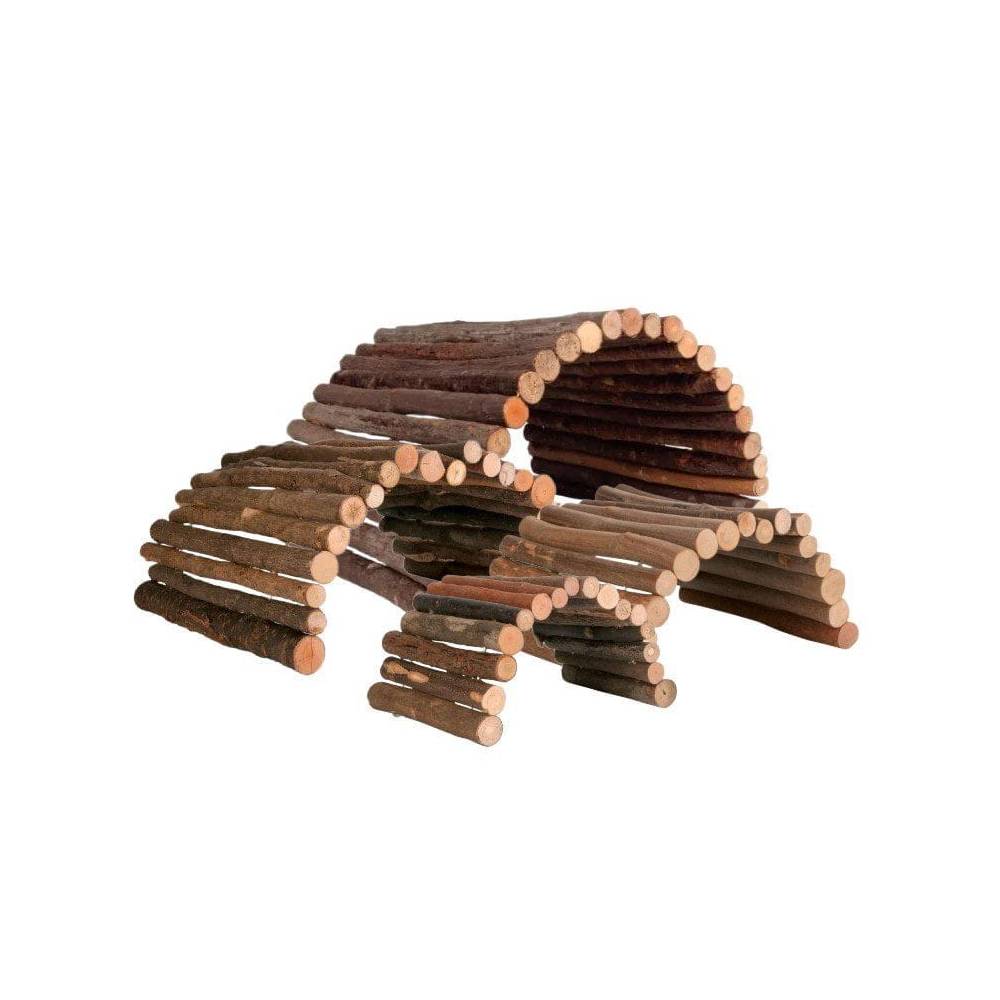 Domek został specjalnie zaprojektowany, aby zapewnić zwierzętom większą przestrzeń do życia i schronienie. Właściwa kryjówka dla zwierząt jest często niedocenianą cechą naturalnego terrarium. Bez bezpiecznego miejsca do ukrycia się i spania zwierzęta mogą popadać w stres, który wpłynie na ich aktywność i apetyt. Drewniany mostek jest giętki dzięki drucikom, można w ten sposób dopasować kryjówkę pod gryzonie czy gady.