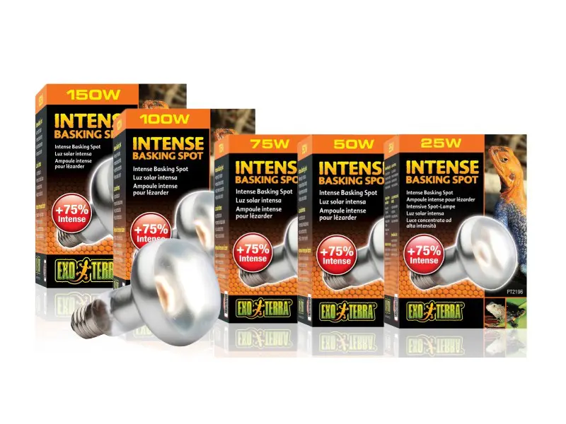 Żarówka Intense Basking Spot od Exoterra to lampa, która została specjalnie zaprojektowana, aby świecić punktowo. Skoncentrowaną wiązkę można precyzyjnie skierować na obszar, aby stworzyć ciepłe miejsce. Ciepło i światło w wiązce są zwiększone o 35% dzięki czemu można zwiększyć odległość między żarówką a obszarem grzewczym. Światło UVA przyczynia się do dobrego samopoczucia fizjologicznego gadów.
