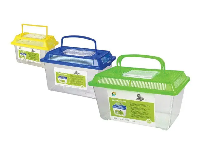 Praktyczne faunarium wykonane z lekkiego, przezroczystego materiału posiada bezpieczne zaokrąglone rogi, wygodny uchwyt–rączkę oraz praktyczne otwory wentylacyjne. Dzięki dużemu otworowi w pokrywie i małej klapce do karmienia jest niezwykle łatwe w obsłudze i czyszczeniu.