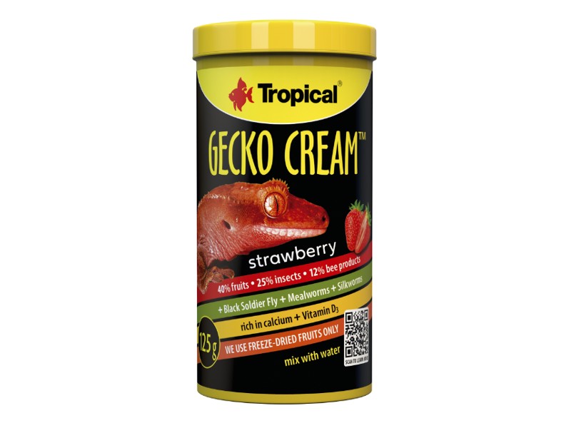 Wieloskładnikowy, w pełni zbilansowany pokarm z truskawką w postaci proszku do sporządzania musu dla gekonów orzęsionych, gargulcowych, omszałych, olbrzymich, wszystkich gatunków felsum oraz innych owoco-owadożernych gadów. Zawiera: 40% owoców, 25% owadów, 12% produktów pszczelich, wapń oraz witaminę D3.