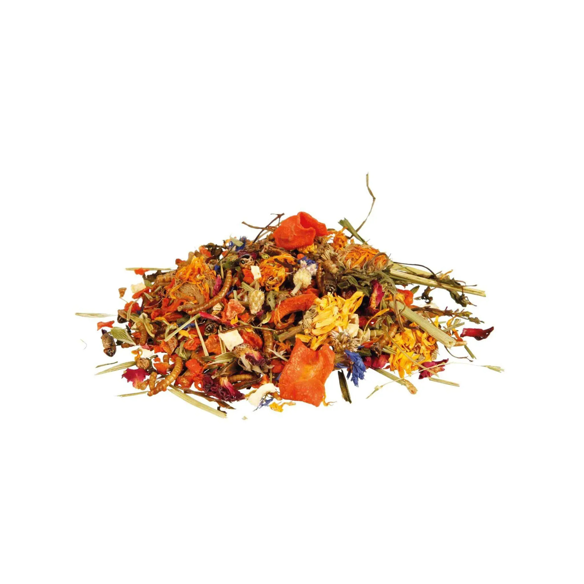 Skład: marchewki, pasternak, konik polny, mączniki, kwiat hibiskusa, babka kruszyna, nagietek, owoc dzikiej róży, mięta pieprzowa, chabry, truskawki, płatki róży | Przechowywać w chłodnym i suchym miejscu.