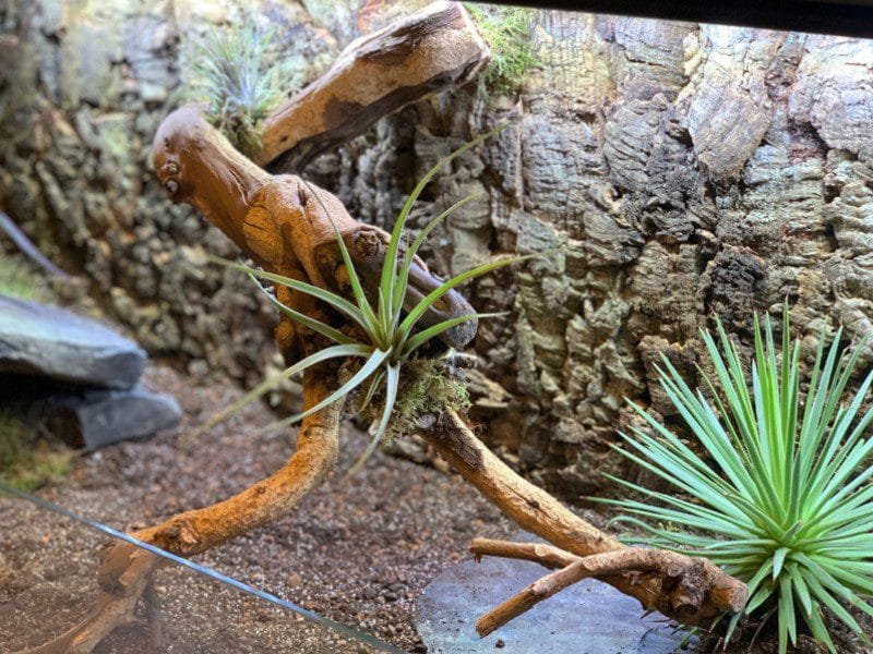 Doskonałym uzupełnieniem aranżacji jest korzeń winorośli, który stanowi elegancką i oryginalną ozdobę. Jego nieregularny kształt pozwala zwierzętom na eksplorację, wspinanie się oraz odpoczynek, jednocześnie wprowadzając do terrarium naturalny, leśny klimat. Połączenie tła korkowego i korzenia winorośli sprawia, że zbiornik staje się harmonijnym, przyjaznym środowiskiem, które nie tylko podoba się mieszkańcom, ale również efektownie prezentuje się w każdym wnętrzu.