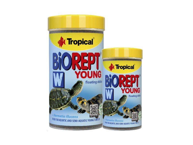 Tropical Biorept W Young to wieloskładnikowy pokarm w formie małych, pływających pałeczek, stworzony z myślą o codziennym żywieniu młodych osobników wszystkożernych i mięsożernych żółwi. Zawiera larwy Hermetia illucens (BSF), bogate w łatwo przyswajalne minerały i białko, wspierające zdrowy rozwój i silną skorupę.