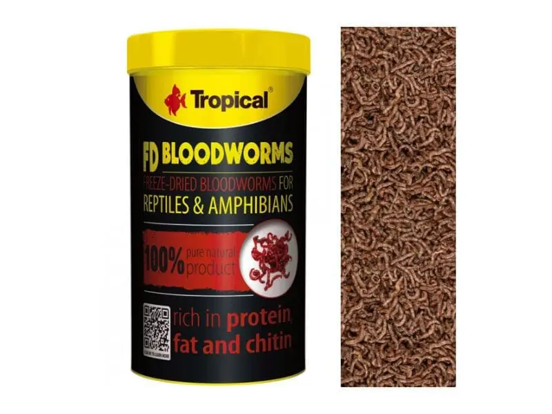 Tropical Blood Worms to pokarm oparty na świeżych larwach ochotki, które zachowują swoje naturalne wartości odżywcze. Stanowi doskonałe źródło łatwostrawnego białka, wspierającego zdrowy rozwój i kondycję zwierząt. Dzięki procesowi liofilizacji pokarm jest wolny od patogenów i w pełni bezpieczny dla gadów oraz ryb.