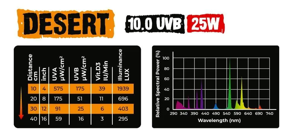 Wysoka intensywność promieniowania UVB odpowiednia dla gatunków zwierząt o wysokim zapotrzebowaniu na promieniowanie UV, które w środowisku naturalnym występują na terenach półpustynnych. Wysoka zawartość UVB powoduje skuteczną syntezę witaminy D3, jednocześnie wspomagając przyswajanie wapnia oraz zapobiegając chorobom metabolicznym. Świetlówka emituje również promieniowanie UVA, które stymuluje apetyt oraz zachowania rozrodcze.